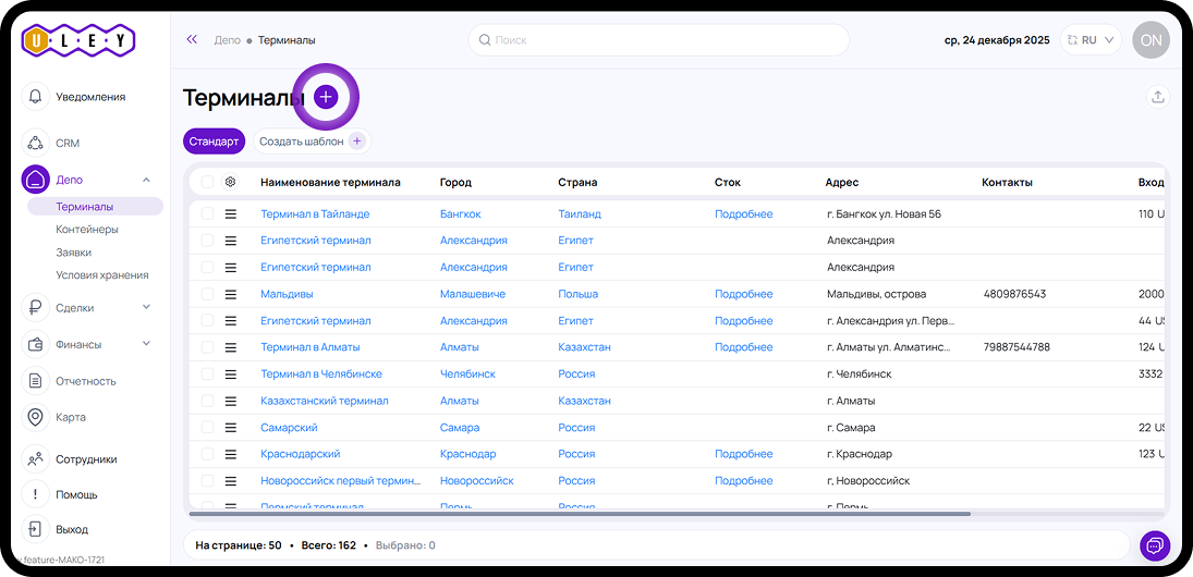 - В левом меню выберите вкладку "Депо" → "Терминалы".