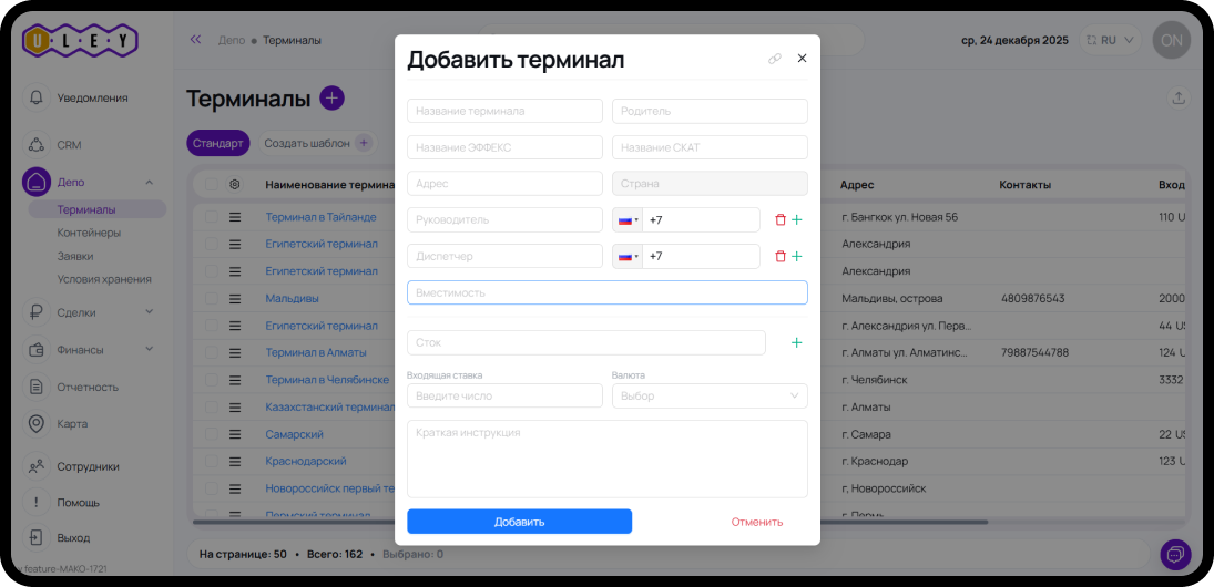 - Вместимость – введите вместимость терминала (например, количество контейнеров).